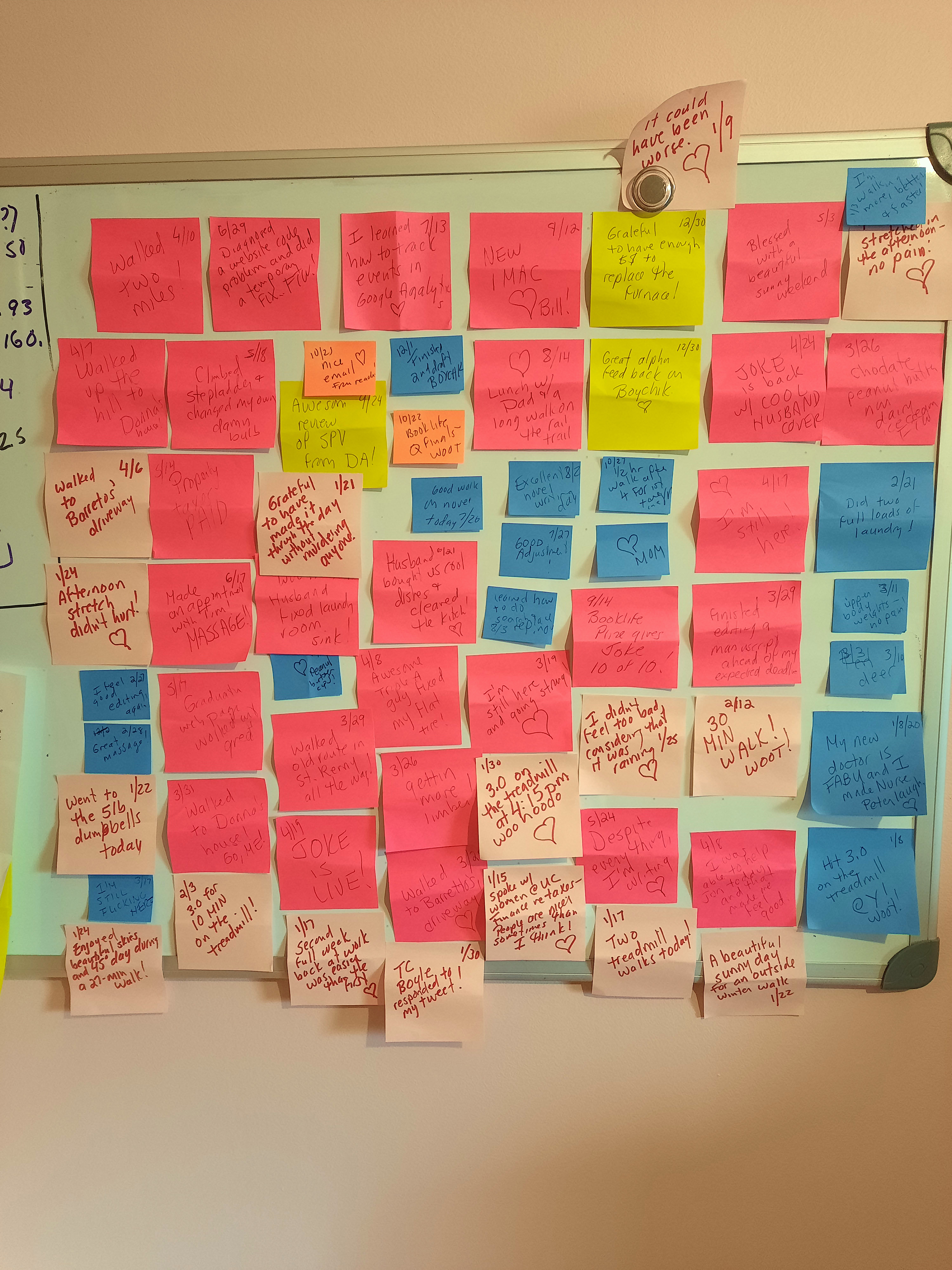 Yesterday, I kept putting it off. Part of me didn’t want to know, didn’t want to revisit 2020, and from what I’ve heard a lot of people felt the same. Why look back in that rearview mirror to see the dumpster fire that we were fleeing? (Because objects in those mirrors are always closer than they appear.) So, I decided to put it off until I was feeling stronger. I got to it this morning, opening the jar, reading the messages, smiling at some of the memories, aching from some others (a loved one surviving a complicated surgery, but died a month after I put the note in the jar). I posted them all over my whiteboard and just immersed myself in the process.